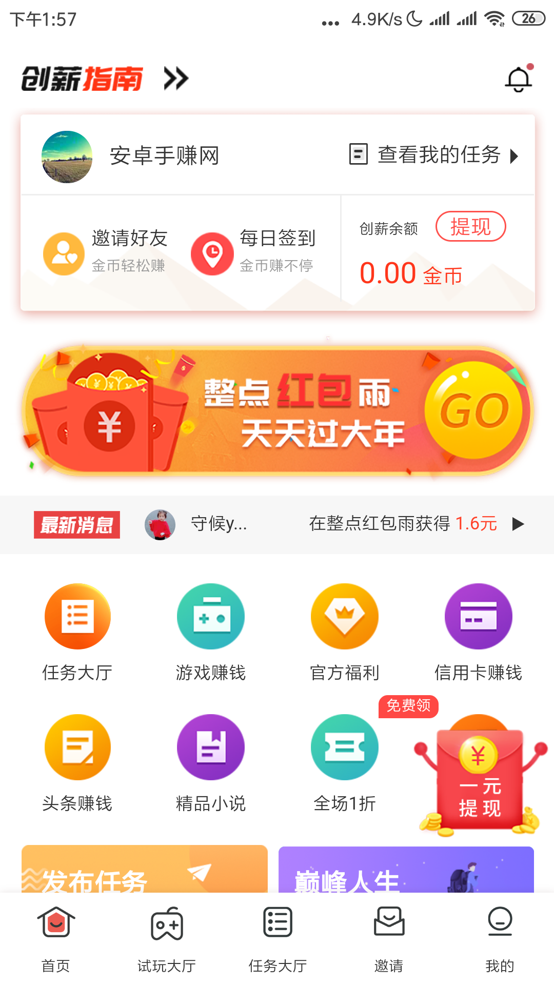 注册即得1张红包券,红包券可直接参加整点抢红包,记得一定要记清楚参加是几点场的开奖,建议定个闹钟,提前2分钟进入页面等待开抢!红包奖励金立即到账。另还有1元完成新手任务即可获得提现机会(新手任务超级简单,1分钟内就能完成)。