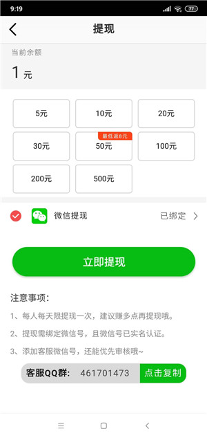 3、满5元就可以申请办理提现,以后满十元提现,初次提现秒到账,以后提现二十四小时内到账