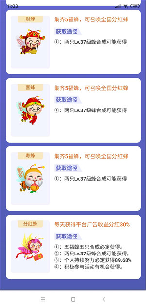 5、五只高級蜂(福、禄、寿、喜、财)生成,百分之百得到分红蜂。