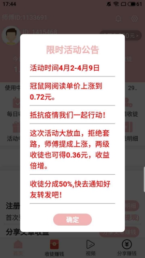冠鼠网APP,冠鼠网是达中科技主打产品转发文章内容赚钱的服务平台,共享文章内容就能赚钱,能够挑选发至微信朋友群或是转发到微信朋友圈,许多人气的地区就可以赚钱,平常单价0.41元(4月2日-4月9日主题活动期内阅读文章单价0.72元),每一ip、每一终端设备每天收费一次,每天盈利不设限制,初次一元就可以提现。
