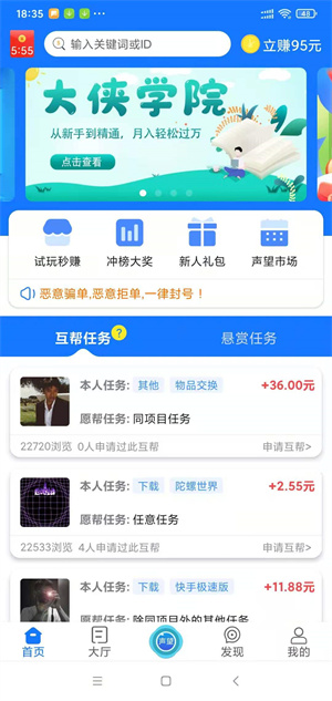 平台内有互帮任务和悬赏任务,互帮任务是为了方便大家互相帮助,要把自己需要互帮的任务申请给别人需要互帮的任务,对方同意后就可以建立互帮,然后互相完成对方的任务。