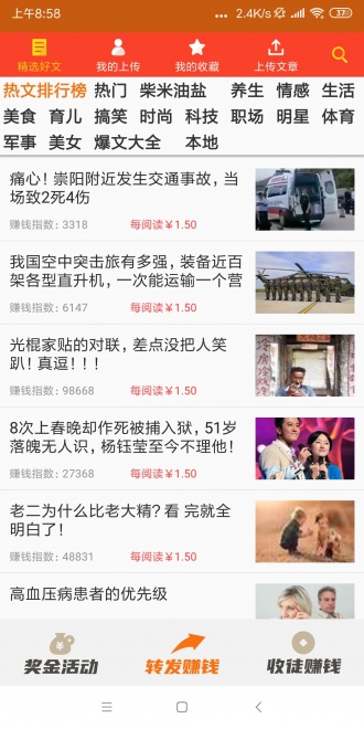 一、下载注册即送2元,转发文章赚钱,文章阅读单价0.15元,支持上载文章。
