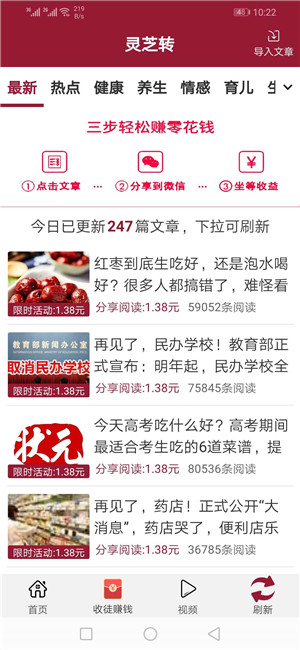 1、新用户下载注册灵芝转app奖励一元,转发被阅读文章单价达到1.38元/次