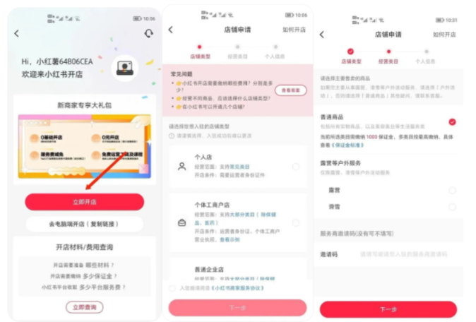 2. 申请开店,在小红书App首页点击左侧三横,进入【创作者中心】,点击【更多服务】,选择【开通店铺】,填写店铺信息、经营类目等,提交申请,小红书会在3-5个工作日内审核通过。