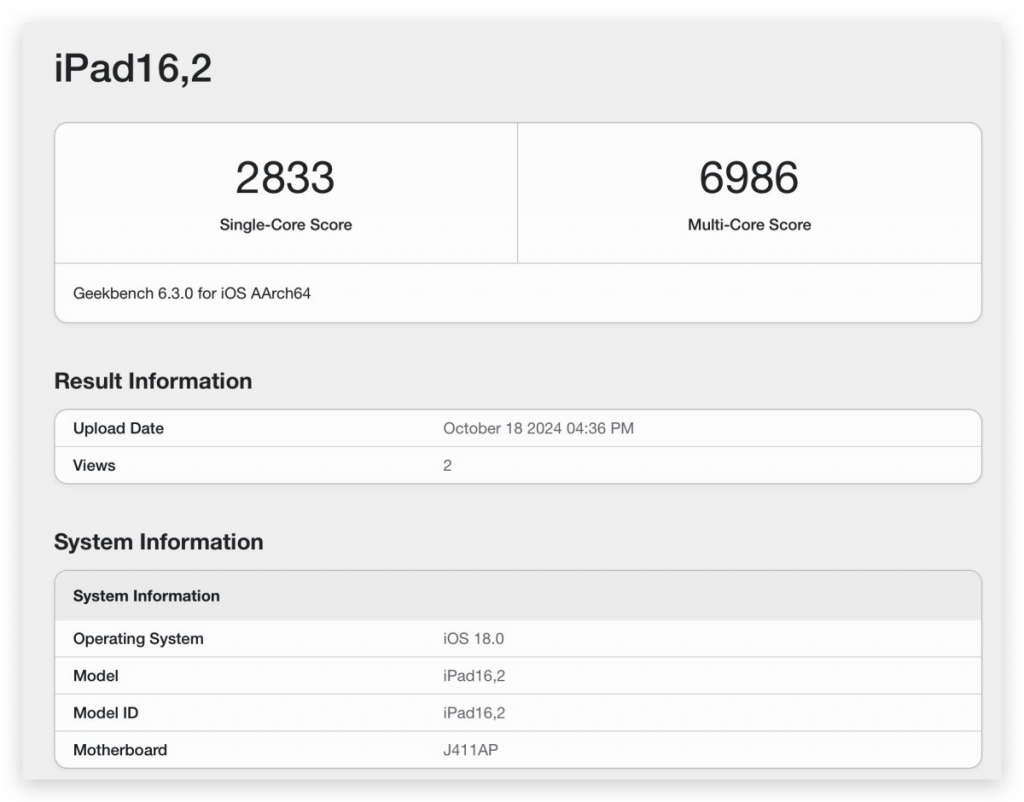 日前跑分网站 Geekbench 公布了多组机型识别码为「iPad 16,2」的跑分数据,由于这是一组全新的 iPad 机型识别码,加上 Geekbench 网站上也有标明是「A17 Pro」; 因此基本上可确认是 iPad mini 7 的跑分数据。