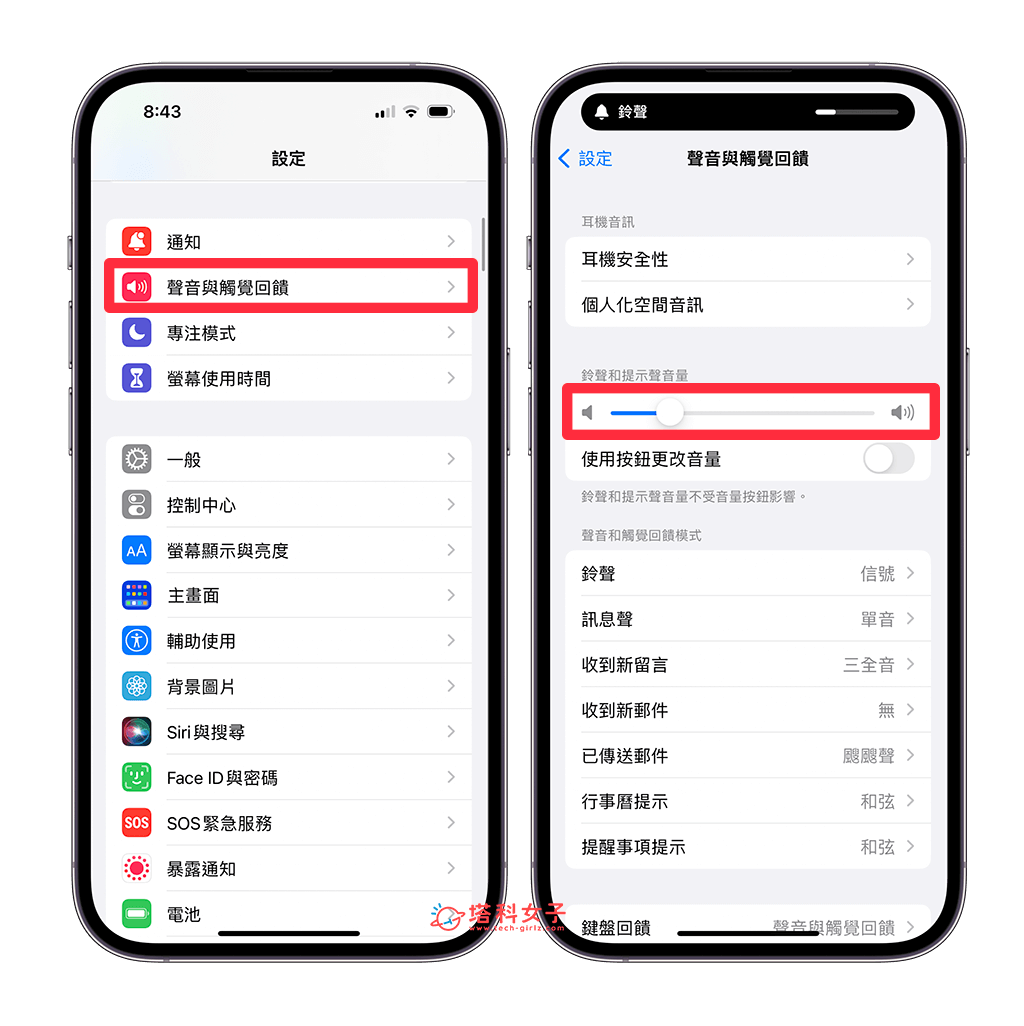 其实很简单,我们需要进到「声音与触觉回馈」中调整「铃声和提示声音量」,这样就能让 iPhone 键盘声音变大声!以下是 iPhone 打字声音调整步骤:开启 iPhone 内置的「设置 app」。点选「声音与触觉回馈」。调整「铃声与提示声音量」下方横杆,往左越小声,往右越大声。