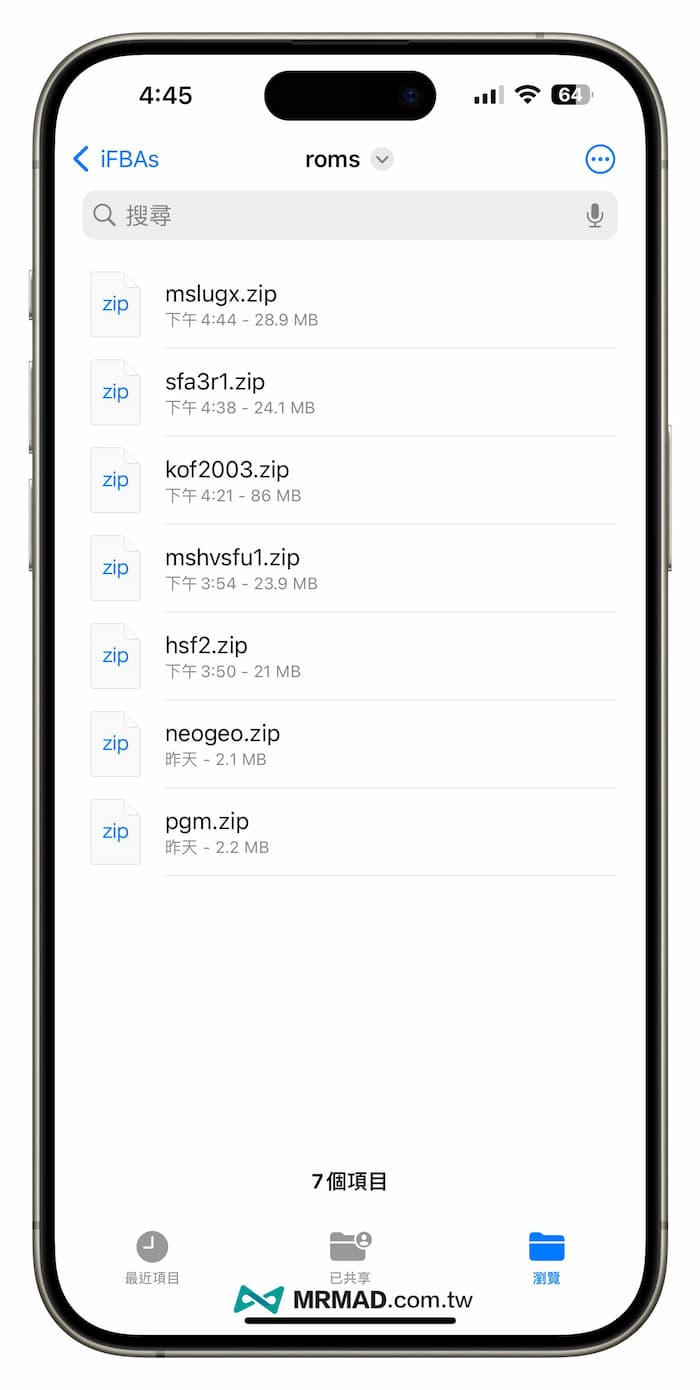 将游戏全部放入「我的iPhone」目录底下的「iFBAs > roms」文件夹内,所有游戏都要维持压缩包状态,才能够让 iFBAs 模拟器读取,切记档名请勿使用中文,要保持全英文格式。