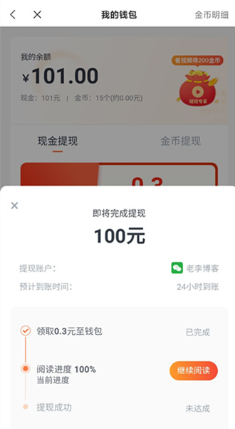 有两个条件:第一是领到钱包的0.3元,这一门槛,在我们注册后,可以完成,比较简单;第二,阅读进度100%,这个门槛,有点高,要100%地完成,需要看一本小说。当代小说,基本上有几百万字,读过之后,估计要用几个月。