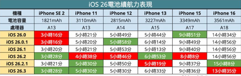 最后从整体iOS 26电池续航力统计数据来看,能发现多款iPhone机型升级iOS 26.3后,在续航力表现下都相当优秀,像是iPhone SE 2、iPhone 11都能拿下iOS 26系列中最长的续航表现版本。