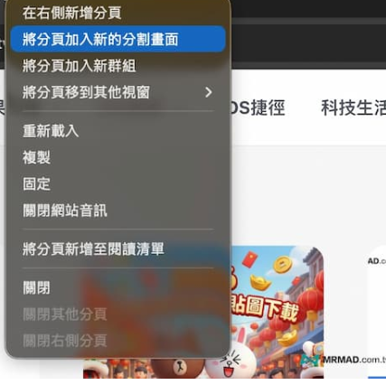 先开启想要作为主要对照的第一个 Chrome 网页标签,在浏览器最上方的「分页标签」上点击鼠标右键选择「将标签加入新的分割画面」。
