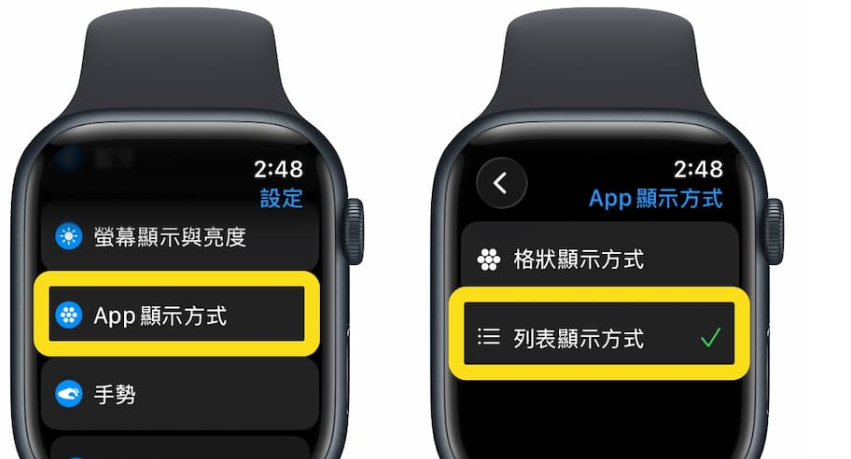 不少人抱怨 watchOS 应用程式采格状排列不好找,其实只要在 iPhone 的 Watch App 中,进入「App 显示方式」,改为「列表显示」,之后按下数字表冠,所有 App 就会变成可卷动清单,这是更直觉的整理方式。