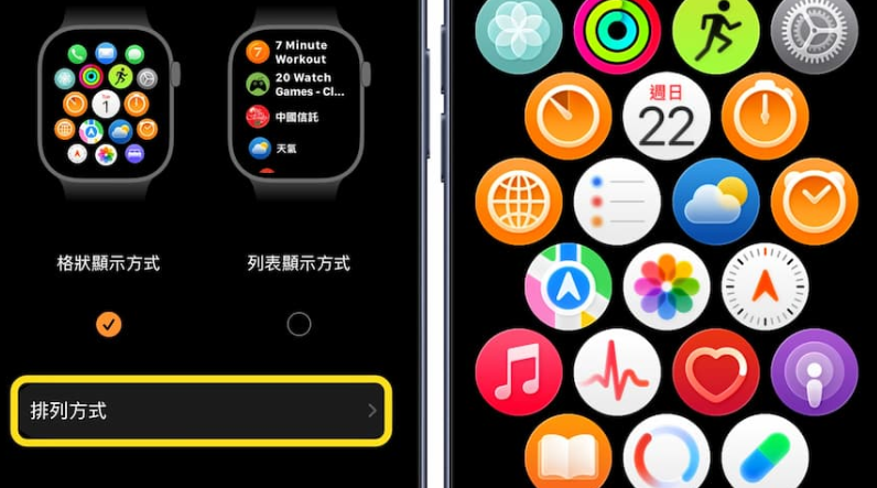 在格状画面中长按图标,等图标晃动后即可拖曳排序,或直接在 iPhone 上的 Watch App 里进入「App显示方式」,选择「排列方式」来调整位置,可以把常用功能放在最顺手的位置,长期下来会明显提升使用流畅度。