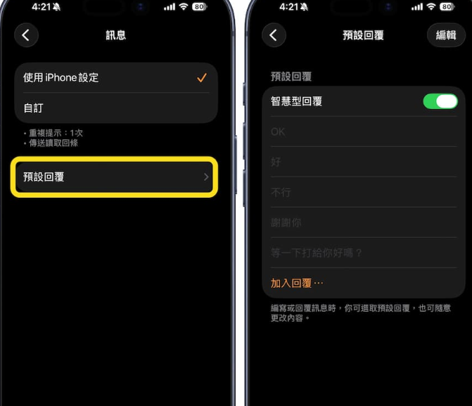 在 iPhone 的 Watch App 中,进入「消息 ➝ 默认回复」即可修改常用回应,后续当 Apple Watch 收到消息时,直接向下滑动,选择一句话快速回复,比打字更有效率。