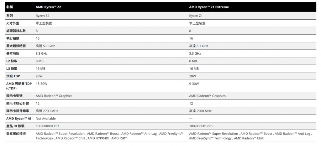 此外,在二代芯片中,中阶的Ryzen Z2的规格几乎与Ryzen Z1 Extreme相同,都是Zen 4架构CPU和RDNA 3架构GPU,仅在时脉上有些许区别,理论上一同开发的成本与难度都不至于太过困难。