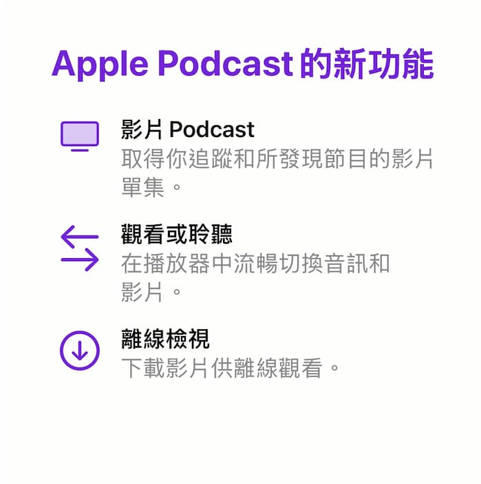 开启 Apple Podcasts 时,会出现新功能介绍页面,强调加入视频 Podcast、观看或聆听与离线下载观看视频。