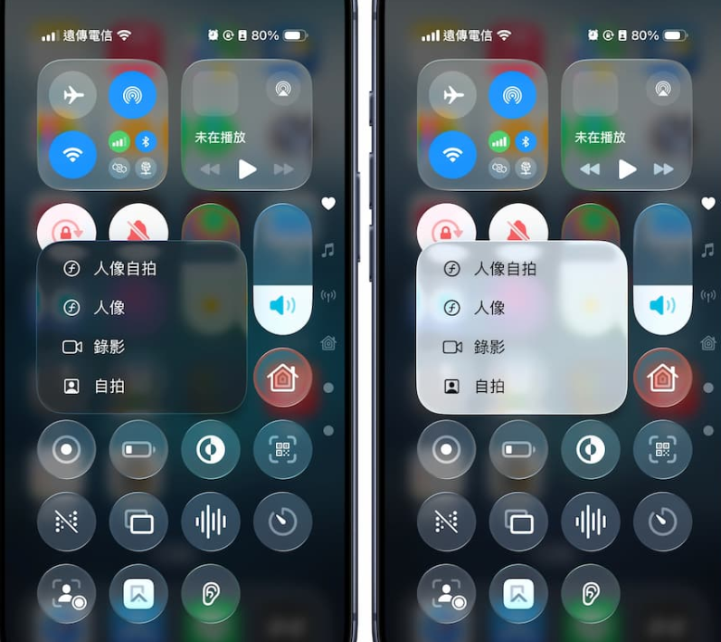 过去版本中,即使开启深色模式,控制中心的菜单仍维持雾面白色背景,在iOS 26.4 Beta 2中,菜单终于改为深色背景显示,视觉一致性明显提升,也让深色模式体验更加完整。