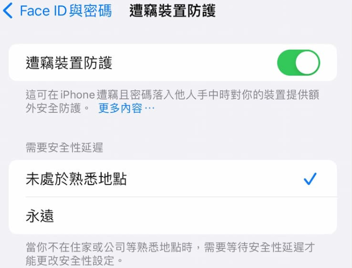 失窃装置保护功能设置在iOS 26.4中改为预设启用状态,该功能主要是能让装置离开住家或办公室等信任地点时,将强制要求生物辨识验证,特定敏感作需经过延后机制与第二次验证。