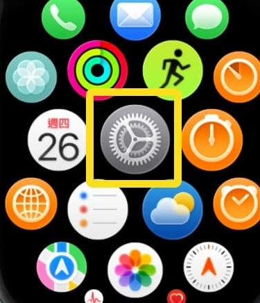 步骤 1. 按压 Apple Watch 右侧的「数字表冠」一下,点选「设置」(齿轮图标)。