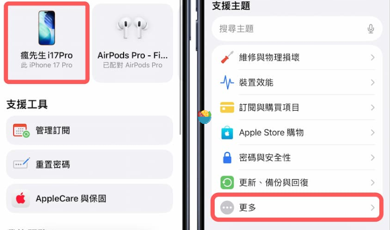 登入Apple 支持App 主画面后,点击「我的设备」下方的「此 iPhone」设备,并且在支持主题内点选「更多」。