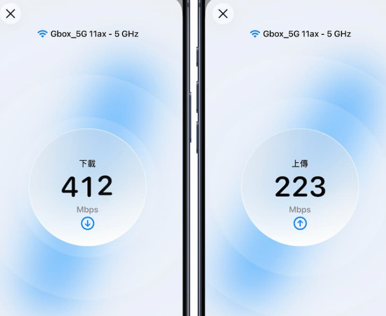 系统就会开始测试iPhone下载与上传速度,过程也能看出当前连线的AP状态,像是顶部能看出目前能连线的通讯协议,像是11ax代表连到Wi-Fi 6,如果是连到11ac就是Wi-Fi 5 ,最后5GHz代表Wi-Fi讯号传数的频道,通常会分成2.4GHz和5GHz两个频段。