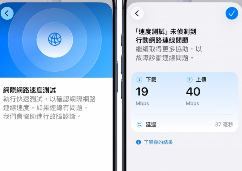 这项内建功能不仅能测试家中或公司的 Wi-Fi 速度,同时也支持 4G/5G 移动网络(蜂窝网络)测试。